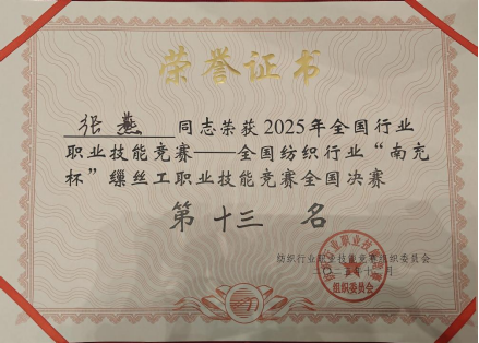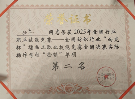 作为全国纺织行业缫丝领域的高水平赛事,本次竞赛是对行业职工技能水平的全面检阅,是技艺交流、匠心传承的重要平台。赛场上,张燕沉着应对各项考核,从操作规范到细节把控,每一个环节都展现出扎实的专业功底和精益求精的工作态度。“捻鞘”单项的亮眼成绩,更凸显了她在专项技能上的突出优势;总成绩跻身全国前列,也印证了她全面过硬的业务能力。